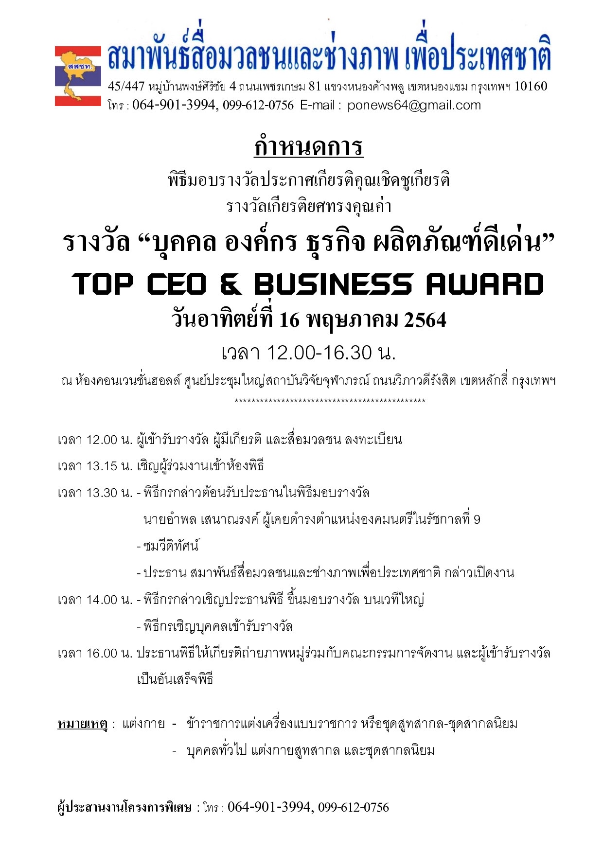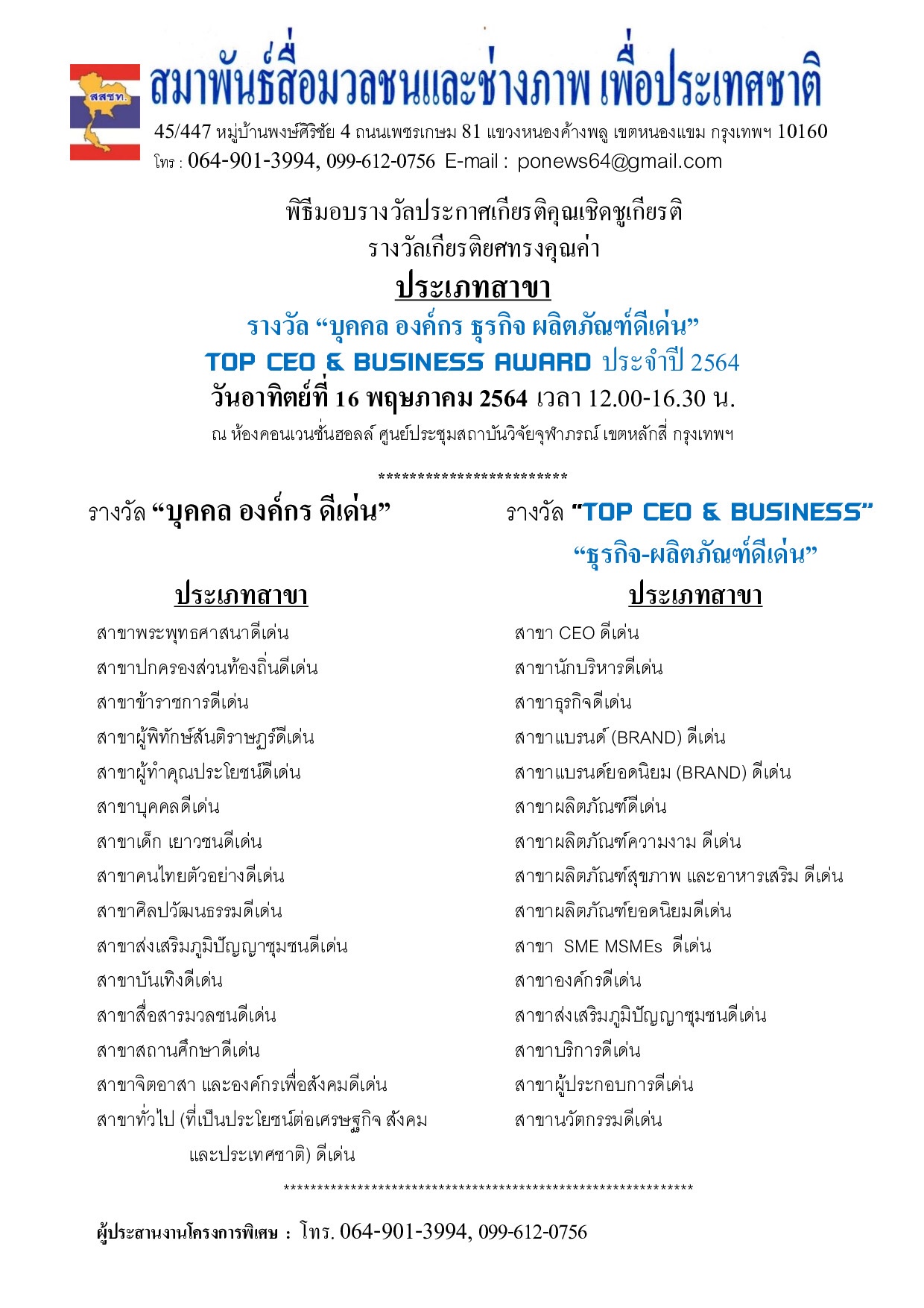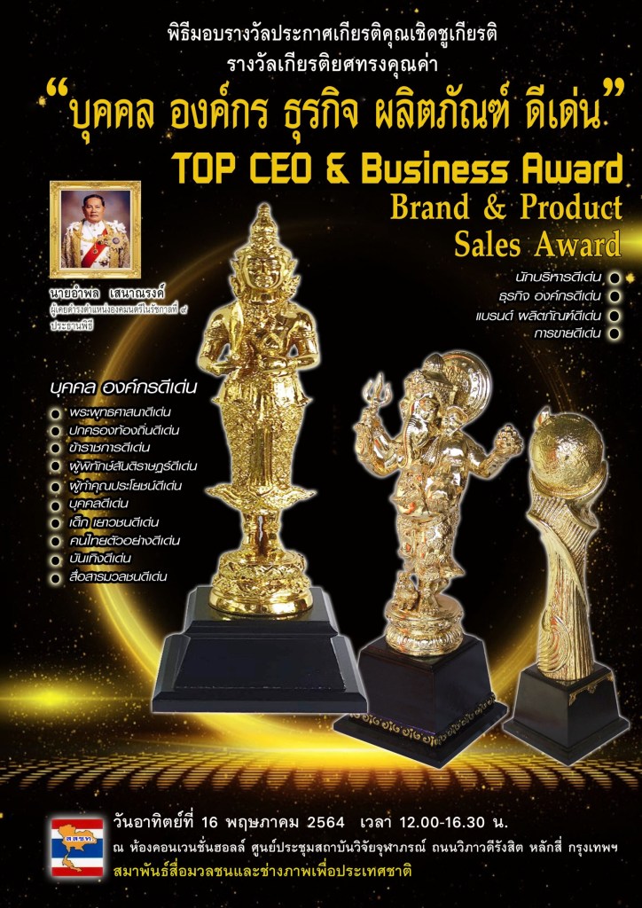 สมาพันธ์สื่อมวลชนและช่างภาพเพื่อประเทศชาติ ขอเชิญส่งชื่อ-ประวัติ-ผลงาน เพื่อพิจารณา สรรหา คัดเลือก เข้ารับรางวัล “บุคคล องค์กร ธุรกิจ ผลิตภัณฑ์ ดีเด่น” TOP CEO & BUSINESS AWARD พิธีมอบรางวัลประกาศเกียรติคุณเชิดชูเกียรติ รางวัลทรงคุณค่า ในวันอาทิตย์ที่ 16 พฤษภาคม 2564 เวลา 12.00-16.30 น. ณ ห้องคอนเวนชั่นฮอลล์ ศูนย์ประชุมสถาบันวิจัยจุฬาภรณ์ ถนนวิภาวดีรังสิต เขตหลักสี่ กรุงเทพฯ